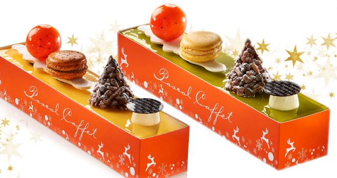 Alerte orange sur Noël à la Maison Pascal Caffet ! Le pâtissier-chocolatier de Troyes (Aube) et Mathieu Blandin Champion du monde de la pâtisserie 2013 et chef pâtissier chez Pascal Caffet proposent une collection de 5 bûches pâtissières : La bûche « Carapira » se compose d’une mousse caramel, d’un biscuit dacquois aux amandes, compotée de poires à la vanille Bourbon de Madagascar, d’un crémeux caramel à la fleur de sel de Guérande et d’un biscuit chocolat intense. La bûche « Saint-Germain » se compose d’un biscuit moelleux aux noisettes, croustillant chocolat feuilleté praliné noisette, crémeux chocolat lait 40 % Côte d’Ivoire au citron vert, caramel vanille, noisettes torréfiées concassées, mousse chocolat lait 40 % Côte d’Ivoire, crème légère vanille citron vert. La bûche « Banquise » associe une mousse au chocolat noir unique 71 % issu de fèves de cacao biologique de Saint-Domingue, biscuit chocolat, biscuit dacquois aux amandes, crème brûlée à la vanille Bourbon de Madagascar, croustillant feuilleté au praliné noisette du Piémont. La bûche « Royal » est composée d’une mousse chocolat noir pur Venezuela 70 %, biscuit chocolat, croustillant chocolat praliné feuilleté, biscuit dacquois aux amandes. La bûche « Exotique » offre une mousse légère et un crémeux aux fruits exotiques, ananas frais au sirop, fraises des bois et biscuit moelleux noix de coco.